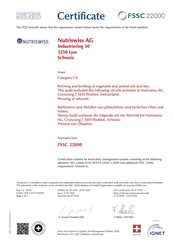 Die Zufriedenheit unserer Kunden und unserer Mitarbeitenden ist ein wesentliches Kriterium für unsere Definition von Qualität. Durch die Umsetzung und Aufrechterhaltung des Qualitätsmanagements sind unsere Prozesse und Abläufe nach FSSC 22000 definiert und dokumentiert.